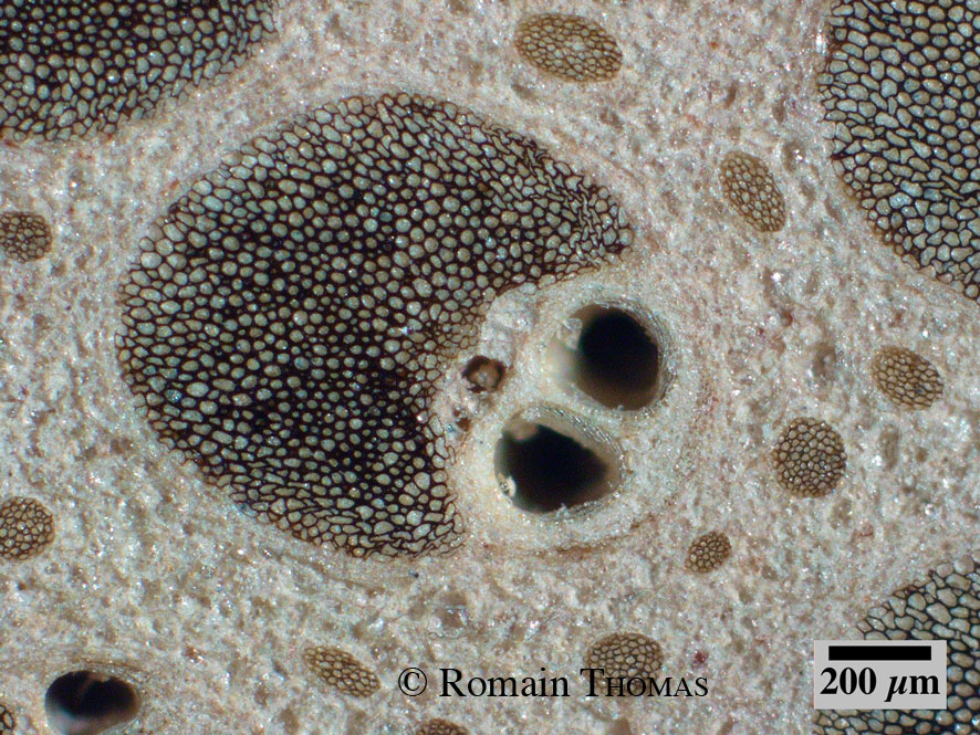 Fibrous bundles are circular in TS, their diameter varies from 20–30 µm (with 5 to 10 cells) to > 200 µm with more than 250 cells (only in Phytelephas Ruiz & Pav.). These fibrous bundles are sometimes more developed in the basal part of the stem than in the apical part.